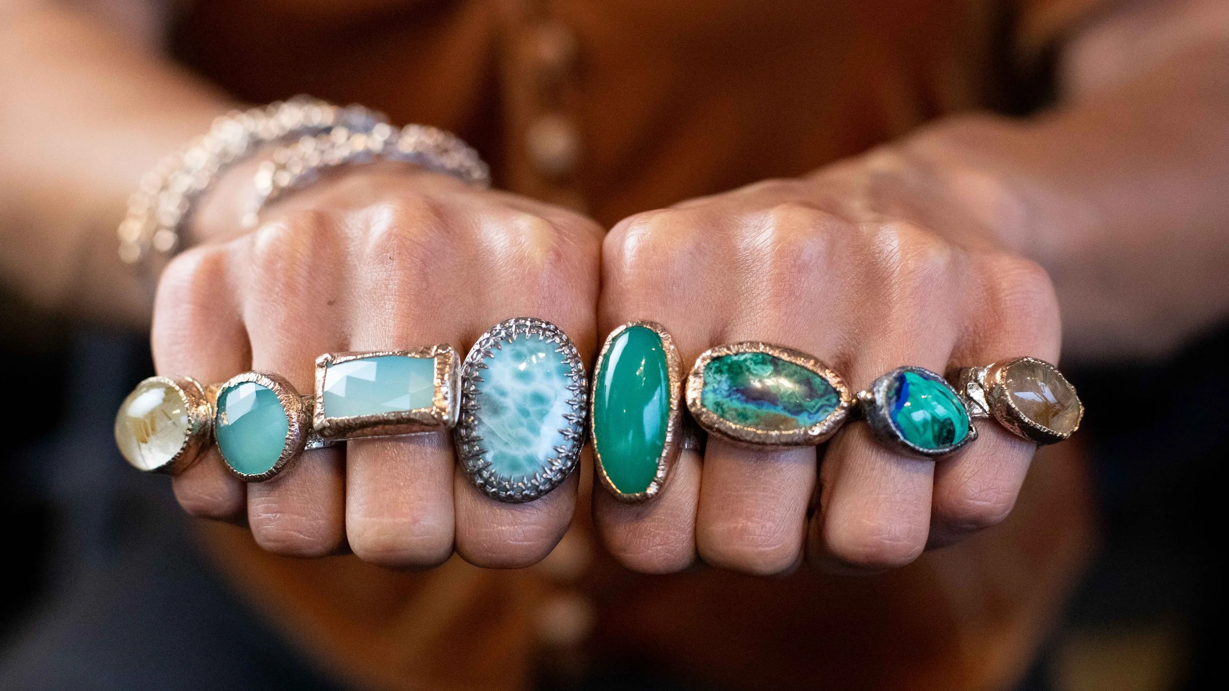 Where Ancient Inspiration Meets Modern Elegance: A vast array of large stone statement rings with an ancient antiquity feel. Fabricated with 14k gold fill & 14k gold and textured with oxidized sterling silver.
